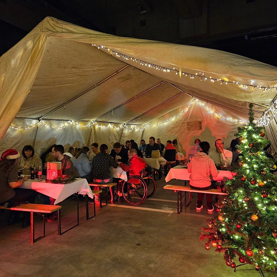 In der festlich geschmückten Fahrzeughalle des Betreuungs- und Logistikzentrums durfte die Bereitschaft gemeinsam einen besonderen Abend verbringen. Kulinarisch wurden die Ehrenamtlichen mit Ente, Rotkohl und Klößen sowie einem weihnachtlichen Nachtisch verwöhnt.
