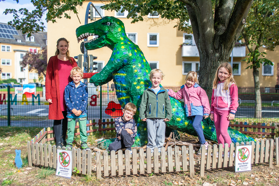 Der Dino entstand im Rahmen des Projekts „In einem Land vor unserer Zeit“, bei welchem die Kinder das Thema "Dinosaurier" behandelten. Im Kinderrat wurde dann darüber abgestimmt, welche Dino-Art in den Vorgarten einziehen sollte. Schritt für Schritt haben die Kinder ihr Vorhaben geplant, Skizzen angefertigt und gemeinsam mit ihren Erzieher:innen gebastelt und gebaut. Das Ergebnis kann sich sehen lassen!